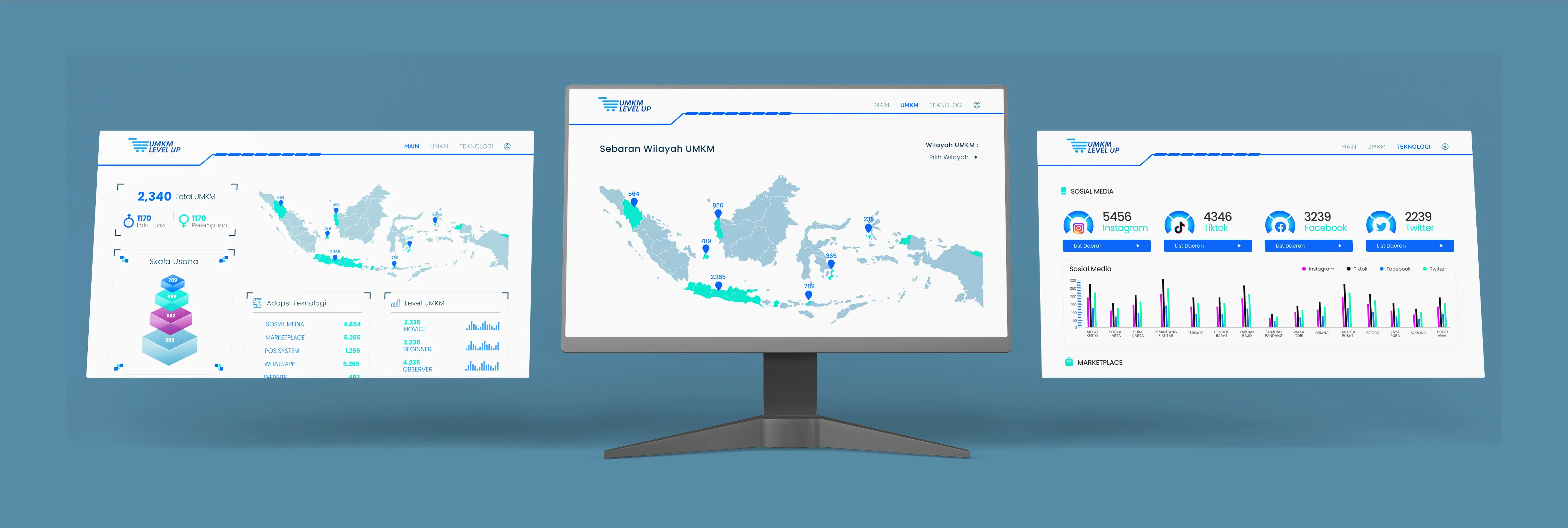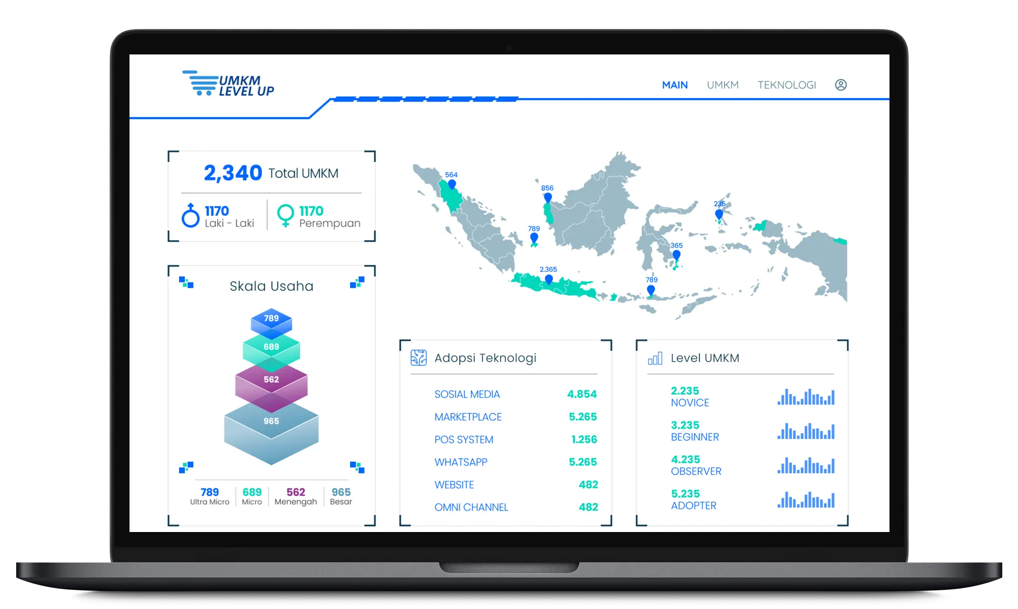 Dashboard UMKM Level Up menyediakan akses terhadap data-data penting terkait UMKM di Indonesia. Mulai dari jumlah total UMKM, skala usaha, hingga tingkat adopsi teknologi dan level UMKM, semuanya divisualisasikan dalam bentuk yang mudah dipahami. Sistem ini membantu pemerintah untuk melakukan evaluasi perkembangan UMKM secara efisien, serta memberikan gambaran yang jelas untuk mendukung pengambilan kebijakan yang tepat guna memperkuat sektor UMKM di Indonesia. Dengan visualisasi data ini, pengguna dapat melacak kemajuan UMKM secara real-time dan mendapatkan insight yang relevan untuk perencanaan lebih lanjut.